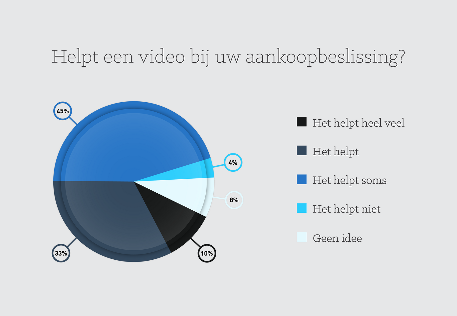 Het onderzoek onder deze respondenten resulteerde in een aantal interessante cijfers: 42,96 procent van de ondervraagden denkt dat een video hen namelijk echt helpt bij het maken van een aankoopbeslissing voor een product of dienst. Daarnaast denkt 45,49 procent dat het hen soms kan helpen bij een aankoopbeslissing. Tenslotte geeft 17,69 procent zelfs aan de afgelopen maand een aankoop te hebben gedaan, op basis van een online video.