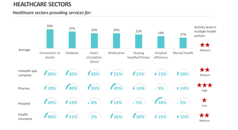 Op basis van de afgelopen rapporten wordt voor de komende vijf jaar verwacht dat diabetes het veld met de beste marktcondities voor digital health oplossingen is, gevolgd door obesitas en depressie. Al hebben succesvolle mHealth-app-uitgevers een wat andere mening over de top drie: zij verwachten dat diabetes nog betere marktcondities heeft dan de andere partijen, zetten depressie op plaats twee en plaatsen verdere alle andere therapievelden onder het gemiddelde van het rapport.