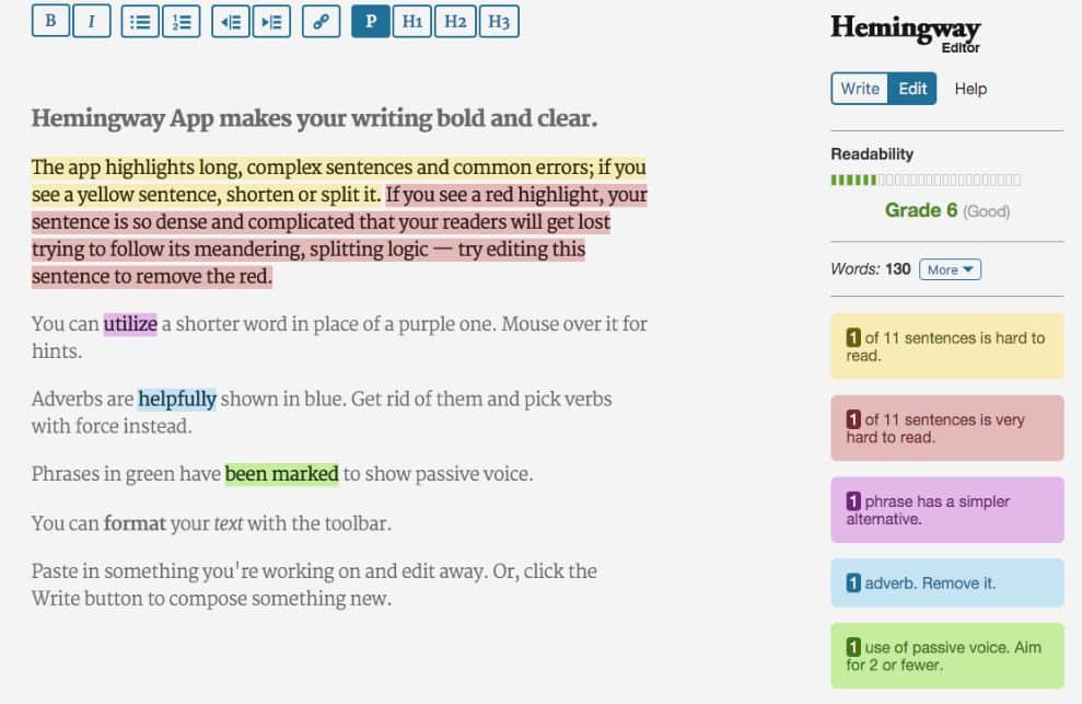 Wil je in minder tijd betere content schrijven? Gebruik de Hemingway-app om je teksten te optimaliseren: een spellingcontrole, maar in plaats van de spelling te controleren, controleert het stijl. Het zorgt ervoor dat je lezer zich zal concentreren op je bericht, niet op de proza. Hemingway beoordeelt het ‘niveau’ van de tekst met behulp van de geautomatiseerde leesbaarheidsindex en markeert de woorden en zinnen die je moet wijzigen om de tekst aantrekkelijker te maken. Deze gratis app is als een geautomatiseerde proeflezer die inhoud overtuigender en effectiever maakt.