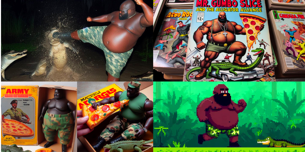 De meme is een intrigerend voorbeeld van hoe kunstmatige intelligentie (AI) en menselijke creativiteit samensmelten om nieuwe culturele fenomenen te creëren. Gumbo Slice kwam tot leven dankzij een serie door AI-gegenereerde afbeeldingen gepost op de Facebook-pagina van Uncle Mike’s Photography op 30 september 2023, waarbij het personage voor het eerst te zien was in de “Alligator Kick” meme. De populariteit van Gumbo Slice groeide snel, met tal van tekeningen en fanart verspreid over platforms zoals Twitter en Reddit. Zo werden er stripboeken, actiefiguren, films, games en verpakkingen voor cornflakes verzonnen.