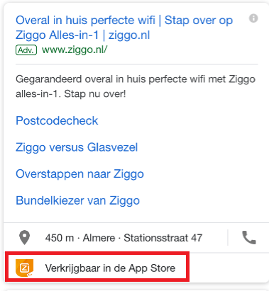 Veel bedrijven hebben naast een website ook een mobiele app. Met behulp van de app-extensie heb je als adverteerder de mogelijkheid om naast je website ook de app te promoten. De app-extensie is klikbaar en linkt direct door naar Google Play of Apple App Store. De klik op de advertentietitel zorgt er nog steeds voor dat de bezoeker ‘gewoon’ naar de website gaat.