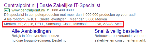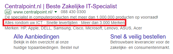 Een highlight-extensie geeft je de mogelijkheid om scherpe aanbiedingen of mooie USP’s van een bedrijf te promoten. Deze extensie geeft informatie mee over een goede service, zoals bijvoorbeeld een snelle levering of gratis verzending. Per advertentie worden twee tot zes highlights weergegeven, afhankelijk van dezelfde factoren als bij de sitelink.