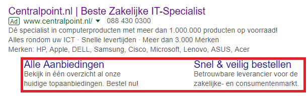 De sitelink maakt het mogelijk om meer links aan de advertentie toe te voegen, die mensen naar een specifiek gedeelte van de website leidt. Wanneer bezoekers op de link klikken, belanden ze direct op de juiste plek. Heel handig als iemand zoekt naar bijvoorbeeld een specifieke laptop: in dit geval kun je in de sitelinks een aantal interessante accessoires opnemen die passen bij de laptop of het merk. Per advertentie worden minimaal twee en maximaal acht sitelinks getoond.