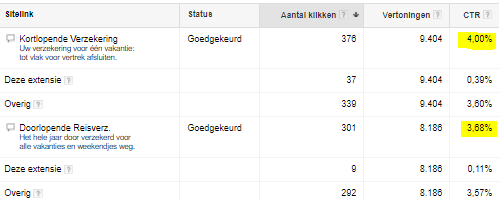 In bovenstaand voorbeeld zijn twee sitelinks weergegeven met daarin de resultaten. Over het algemeen is de CTR bij een advertentie met daarin de sitelink met informatie over de kortlopende reisverzekering 4 procent, 8 procent hoger dan een advertentie met de sitelink van doorlopende reisverzekeringen. In dit geval zouden we ervoor kunnen kiezen om de sitelink met doorlopende reisverzekering te vervangen door een nieuwe, om hiermee de CTR te blijven ontwikkelen. Daarnaast zie je in de afbeelding ook de CTR op de extensie zelf.