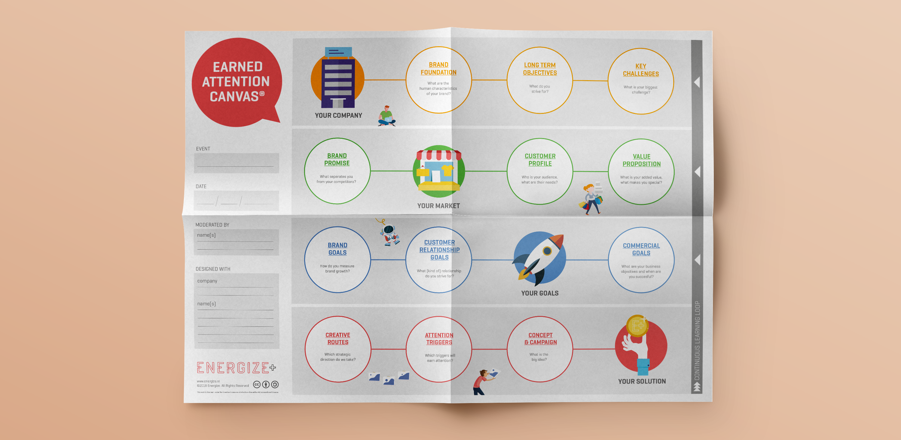 Als je verdiende aandacht wilt genereren, zul je van toegevoegde waarde moeten zijn in het leven van je klant. Om je op een gestructureerde manier te helpen, heeft Energize het Verdiende Aandacht Canvas ontwikkeld, een handige tool die business-, marketing- en merkcommunicatietools integreert. Het Verdiende Aandacht Canvas neemt jou en je team aan de hand en helpt je om in vier stappen naar verdiende aandacht toe te werken.