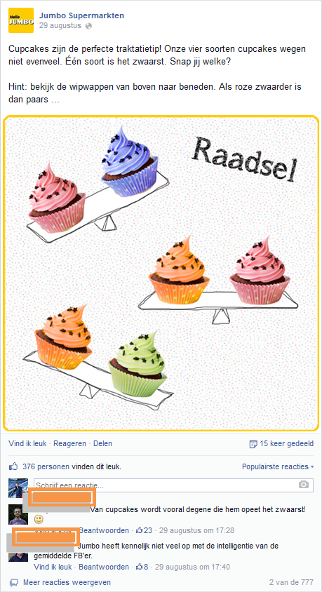 Soms maakt Jumbo de, door de fans vaak gewaardeerde, raadsels iets te makkelijk. De vier soorten cupcakes van Jumbo in de bijgevoegde afbeelding wegen niet even veel. Één soort is het zwaarst. De Jumbo-fans mogen raden welke. Nou is dit raadsel op zich al niet te moeilijk, maar Jumbo acht het ook nog nodig om een goede hint te geven. Zijn de fans soms achterlijk? Een greep uit de reacties: