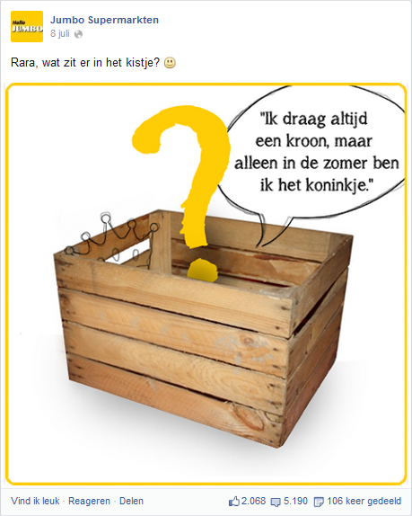 Bij Jumbo zijn het de consequent geel omcirkelde updates, die direct opvallen in de tijdlijn. Bij Nutella zien we regelmatig het chocoladekader terug. Naast de look wordt ook aan de inhoud gedacht. Het gesprek wordt opgezocht en dat gaat verder dan slechts de vraag in de update. Contentstrategie, socialmediastrategie, onder andere Jumbo heeft het. Het bedrijf van de vijf gele letters streelt het algoritme van Facebook qua interactie. De door sommige mensen uitgekotste richtlijnen en huisstijlhandboekjes worden nageleefd. En dat werkt – in dit geval althans – meestal wel prima. Voor de fans en voor Jumbo zelf. Is het dan allemaal zo rooskleurig?