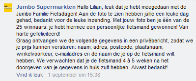 “Hallo Erik, leuk dat je hebt meegedaan met de Jumbo Familie Fietsdagen! Aan de foto te zien hebben jullie een leuke dag gehad, bedankt voor de leuke inzending. Met jouw foto ben je één van de 25 winnaars: je hebt hiermee een persoonlijke fietsmand gewonnen! Van harte gefeliciteerd! Graag ontvangen we de volgende gegevens in een privébericht, zodat we je prijs kunnen versturen: naam, adres… (enzovoort).”