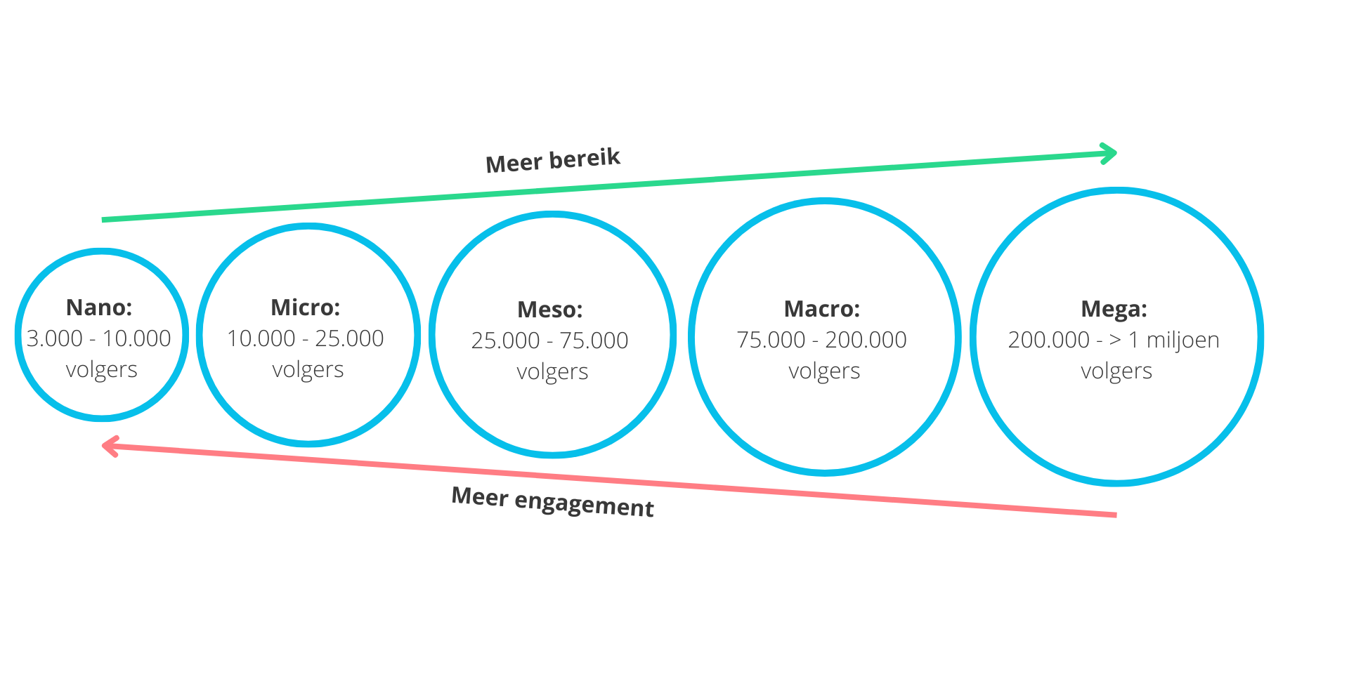 De hoeveelheid volgers van een influencer is bepalend voor het type impact van jullie samenwerking. In de regel scoren influencers met minder volgers, hoger op engagement, terwijl grotere influencers logischerwijs meer bereik hebben. Grijp bij het kiezen van een influencer daarom terug op je doelstelling. Wil je bereik? Go big. Wil je interactie? Kies voor een influencer met minder volgers. Om overzicht te houden, kun je denken in termen van nano, micro, meso, macro en mega.
