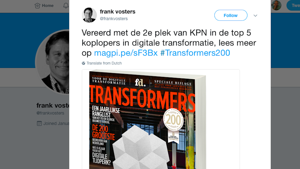 Dat begon een dag voordat de bijlage met de onderzoeksresultaten bij de abonnees in de bus lag. Op vrijdagochtend 23 juni was het Frank Vosters, client manager bij KPN, die als eerste het volgende bericht op Twitter deelde: