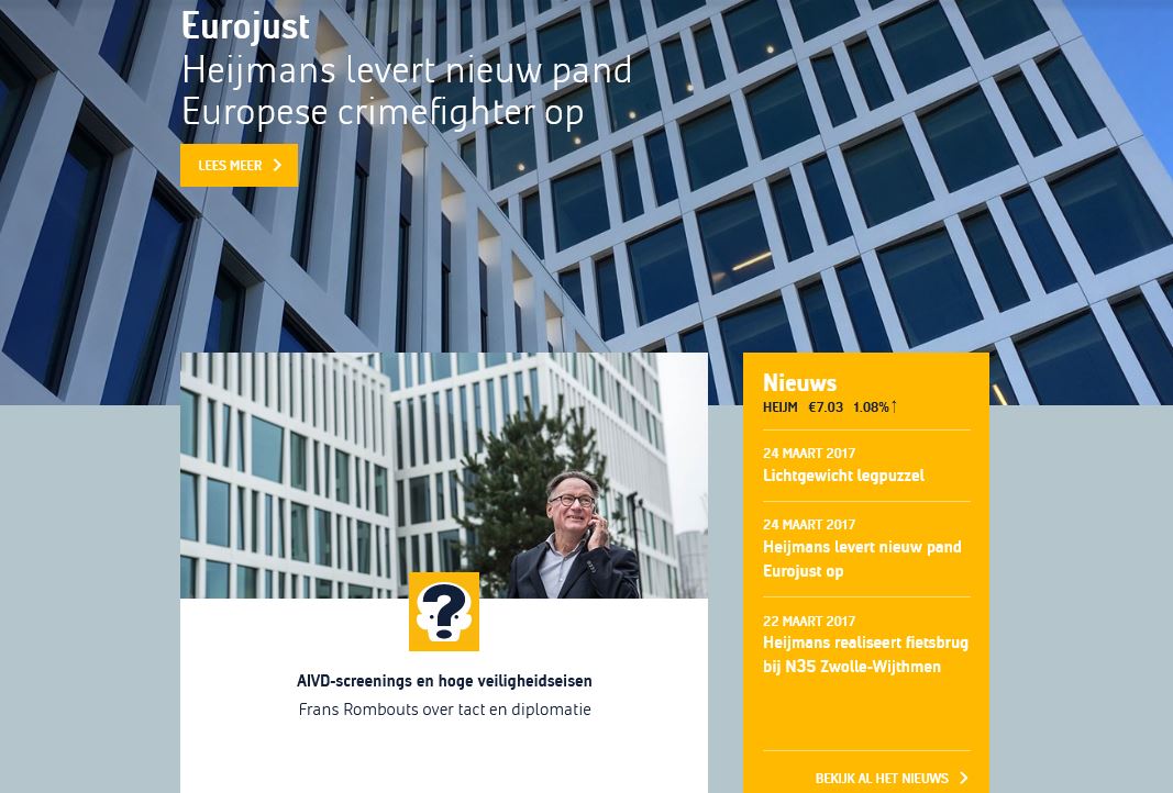 “We realiseerden ons dat we niet de transitie in organisatie en positionering konden maken met de bestaande communicatiestrategie. Uiteindelijk hebben we de corporate website compleet op de schop genomen en ingericht als dynamisch platform. Het is een verhalenmachine geworden die aansluit bij de tijdgeest. We werken als communicatieafdeling nu niet meer versnipperd, maar als één redactie, zitten bovenop het nieuws en delen dagelijks content: via inhoudelijke verhalen, visueel aantrekkelijk gepresenteerd, persoonlijk en vanuit één merk. We lopen een klein beetje voorop en trekken het bedrijf een bepaalde richting op, stap voor stap. Dat werkt extern door, naar onze klanten en de bedrijven waarmee we nieuwe projecten ontwikkelen. Maar ook intern, naar onze eigen medewerkers: het laat de dynamiek binnen Heijmans zien op allerlei fronten, de innovatieve oplossingen voor klanten en maakt dat we samen trots zijn op het geleverde werk.”