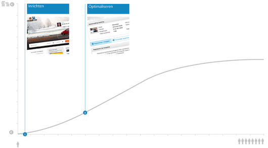 Met groei komt ook de bijbehorende overhead. E-commerce-afdelingen veranderen van kleine flexibele units naar professionele maar bureaucratische bedrijfsonderdelen. Op een gegeven moment zorgen extra mensen of budget niet meer voor extra opbrengsten. In tegendeel, mijn ervaring is dat je bij iedere groeifase meer mensen nodig hebt om dezelfde verbetering van de opbrengst te krijgen. Op een gegeven moment weegt de extra investering niet meer op tegen het extra rendement. Sterker nog, de beweging werkt ook andersom: hele grote e-commerceteams kunnen vaak krimpen zonder dat het resultaat daar direct onder leidt. Deze ontwikkeling heb ik geïllustreerd in onderstaande afbeelding, die ik het e-commercegroeiproces genoemd heb.