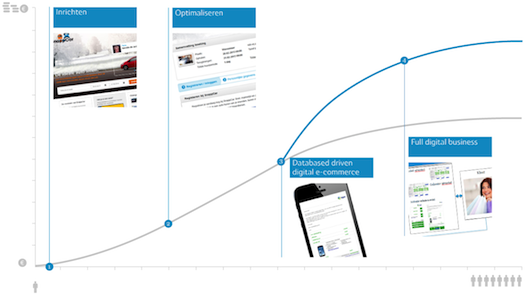Ik zie deze trend in meerdere sectoren: initieel is er een snelle groei van online omzet, ten koste van offline omzet. Op een gegeven moment ontstaat er een stabiel evenwicht tussen online en offline, waarna de groei van beiden gelijk opgaat met de groei van de markt. In deze eerste fase van snelle groei loont het om te investeren in mensen, later loont het om hier rationeel naar te kijken.