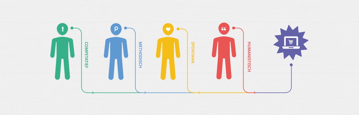 De competitieve bezoeker is een snelle beslisser op basis van feiten. De competitieve bezoeker is heel doelgericht. Hij wil snel weten wat hij hier kan doen. Wat dit aanbod voor hem betekent. De methodische bezoeker beslist, net als de competitieve bezoeker, op feiten. Het beslissingsproces is vaak tergend langzaam. De methodische bezoeker zoekt zekerheid. Hij is bang om fouten te maken, wil alles goed afwegen. Hij is op zoek naar hoe het allemaal werkt. De methodische bezoeker is dol op lijstjes en onderzoekt alles. De spontane bezoeker (de naam zegt het al) is een snelle bezoeker die beslist op basis van emotie. Als het gevoel maar goed is. Hij laat zich niet leiden door feiten, maar door gevoel. Goede service is belangrijk. Ze zijn gevoelig voor aanbiedingen en acties. De humanistische bezoeker is een langzame beslisser, die beslist op basis van emotie. Weldoordacht dus. Hij wil graag weten wie het bedrijf achter een website is. Ervaringen van anderen zijn erg belangrijk. Hoe kan ik je vertrouwen? Wie gebruiken je producten allemaal? Dit zijn typische humanistische vragen.