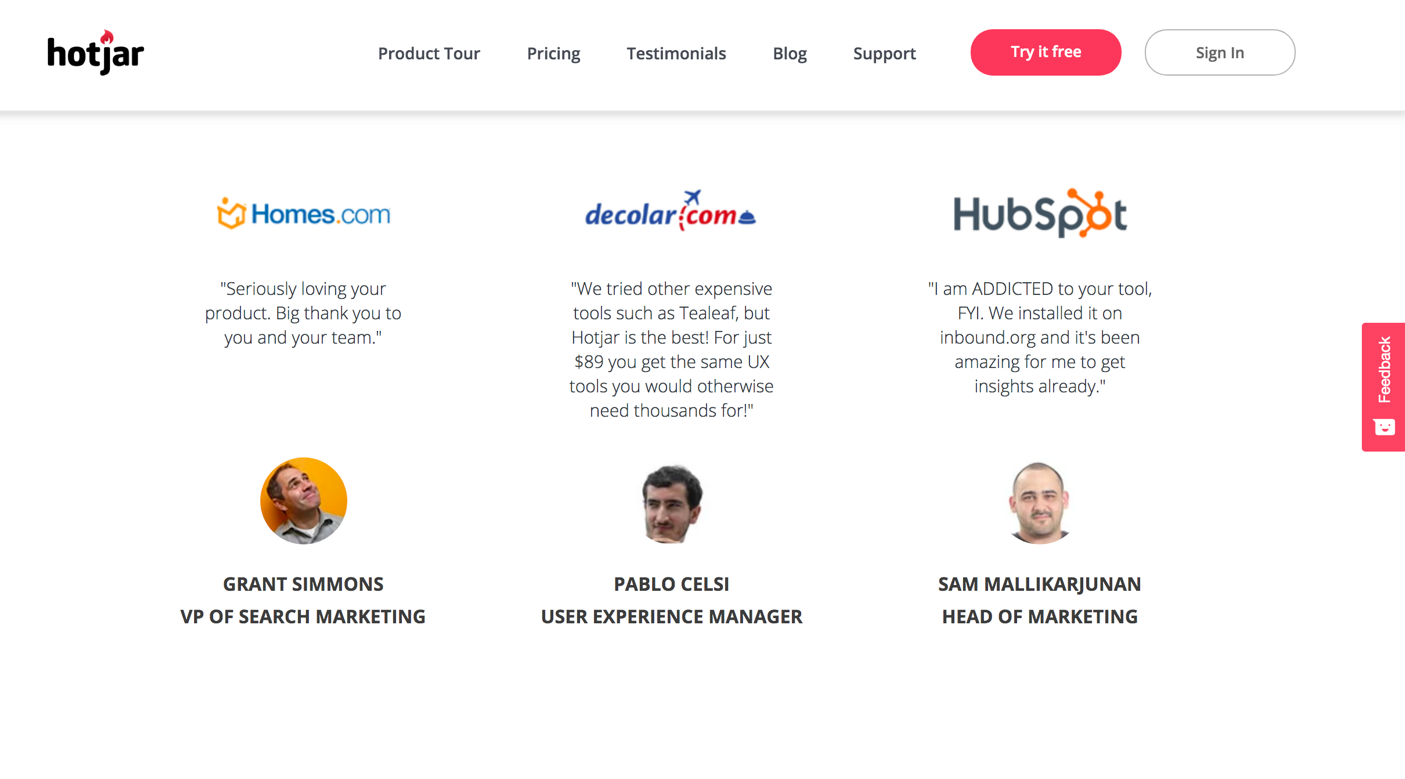 Hotjar is inmiddels een onmisbare speler op het gebied van het analyseren van het gedrag van bezoekers op een website. Hotjar is een veel belovende tool voor gebruikersfeedback. Op hun eigen website tonen ze reviews van gebruikers. Naast de reviews van gebruikers tonen ze ook de mening van enkele experts. Voldoende informatie voor de competitieve bezoeker om tot actie over te gaan. De drempel is laag, want je kan de tool gratis uitproberen. Er is geen enkel risico. Conversie verhogen door onzekerheid te verminderen.