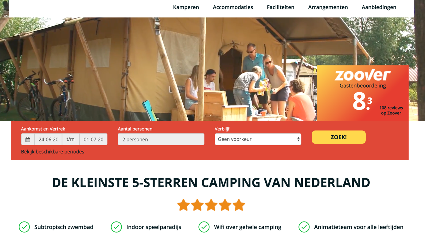 Camping ’t Veld is de kleinste vijf-sterren ANWB-camping van Nederland. Op de homepage van Camping ’t Veld wordt de snelle beslisser op zijn wenken bediend. Let op de groene vinkjes en de korte en krachtige formulering. Less is more voor de spontane bezoeker. Daarnaast is de spontane bezoeker gevoelig voor sfeer. De uitstraling moet de bezoeker een goed gevoel geven. Camping ‘t Veld speelt hier goed op in door een video op de homepage te tonen, waardoor je meteen een compleet overzicht krijgt van de camping en de voorzieningen.