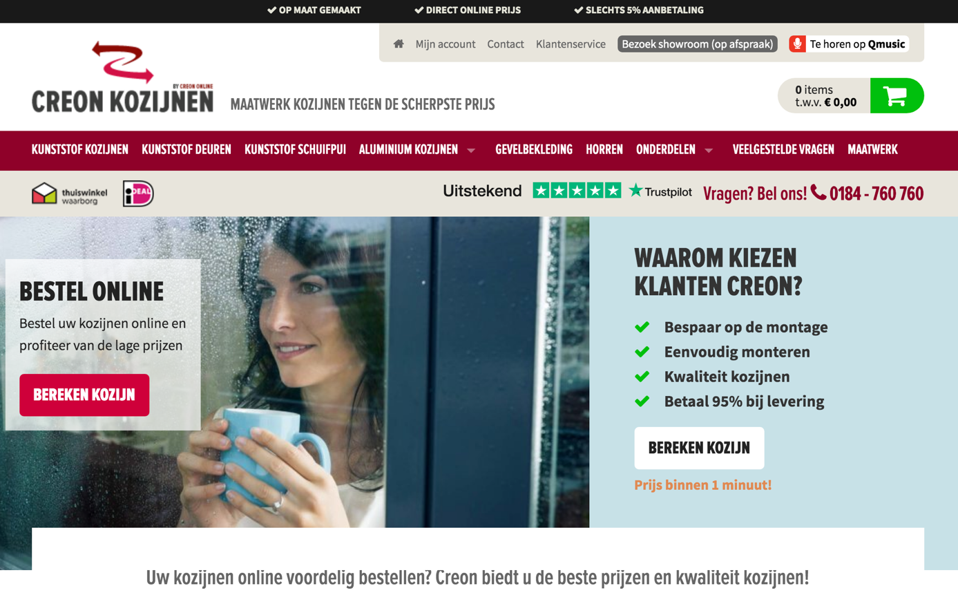 Conversion is trust! De methodische bezoeker is gevoelig voor autoriteit en social proof. Zaken doen draait om vertrouwen. Logo’s scheppen vertrouwen en hiermee kan je de methodische bezoeker onbewust beïnvloeden. De methodische bezoeker wordt bij de homepage van Creon Kozijnen op zijn wenken bedient. Het thuiswinkellogo is goed zichtbaar, maar ook de hoge Trustpilot-reviewscore zorgt voor de sociale bevestiging. Nog niet overtuigd? Je kan Creon ook horen op Qmusic. Ok, het moet wel een bekende en vertrouwde webshop zijn waar je met een gerust hart kan kopen.