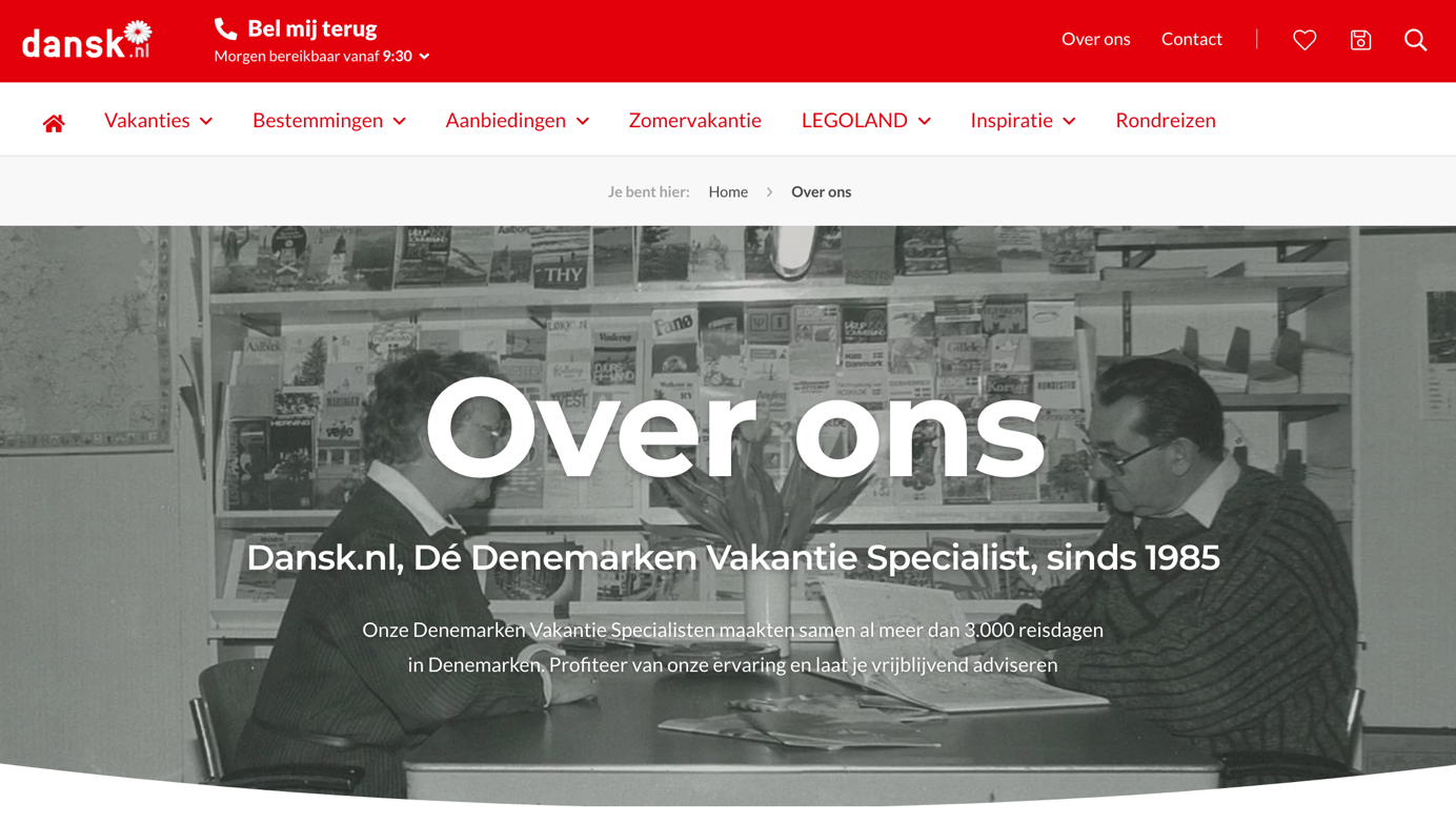 Ter inspiratie, deze ‘over ons’-pagina van Dansk vertelt het verhaal van het bedrijf. Veel organisaties hebben hun bestaansrecht te danken aan een goed verhaal, waarmee het bedrijf ooit is gestart. Dat biedt een mooi aanknopingspunt voor de ‘over ons’-pagina.