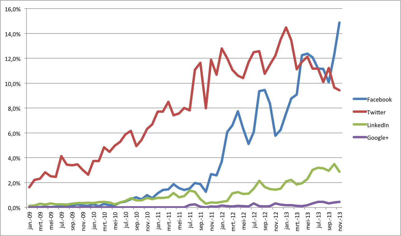 Voor Marketingfacts heeft Facebook een groot aandeel in het verkeer naar het platform. Sterker nog: het is na Google en direct verkeer de 3e verkeersbron. Zo’n 14 procent van het bezoek hebben we aan het plaatsen van links te danken.