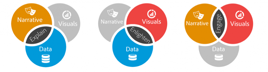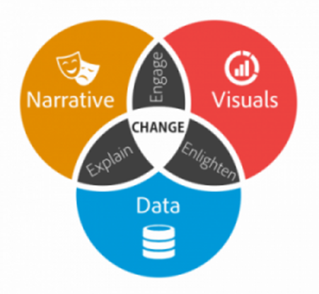 Wanneer het verhaal en de visuals samengevoegd worden, dan zorgen ze samen voor betrokkenheid van het publiek. Wanneer je de juiste combinatie maakt van visualisaties, verhalen en data dan beschik je over een verhaal dat anderen beïnvloedt en overtuigt en hen tot actie aanzet.