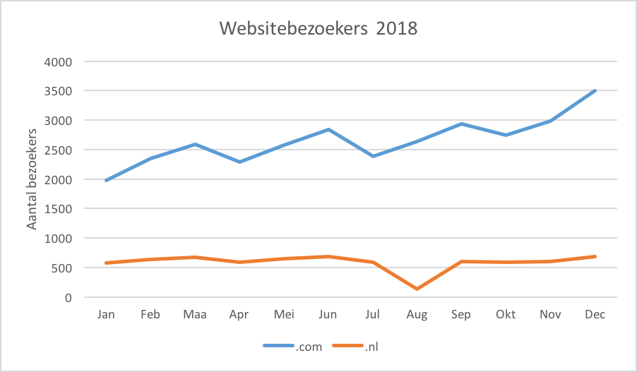 - Het aantal bezoekers van het .com-domein ligt consequent flink hoger dan van het .nl-domein.