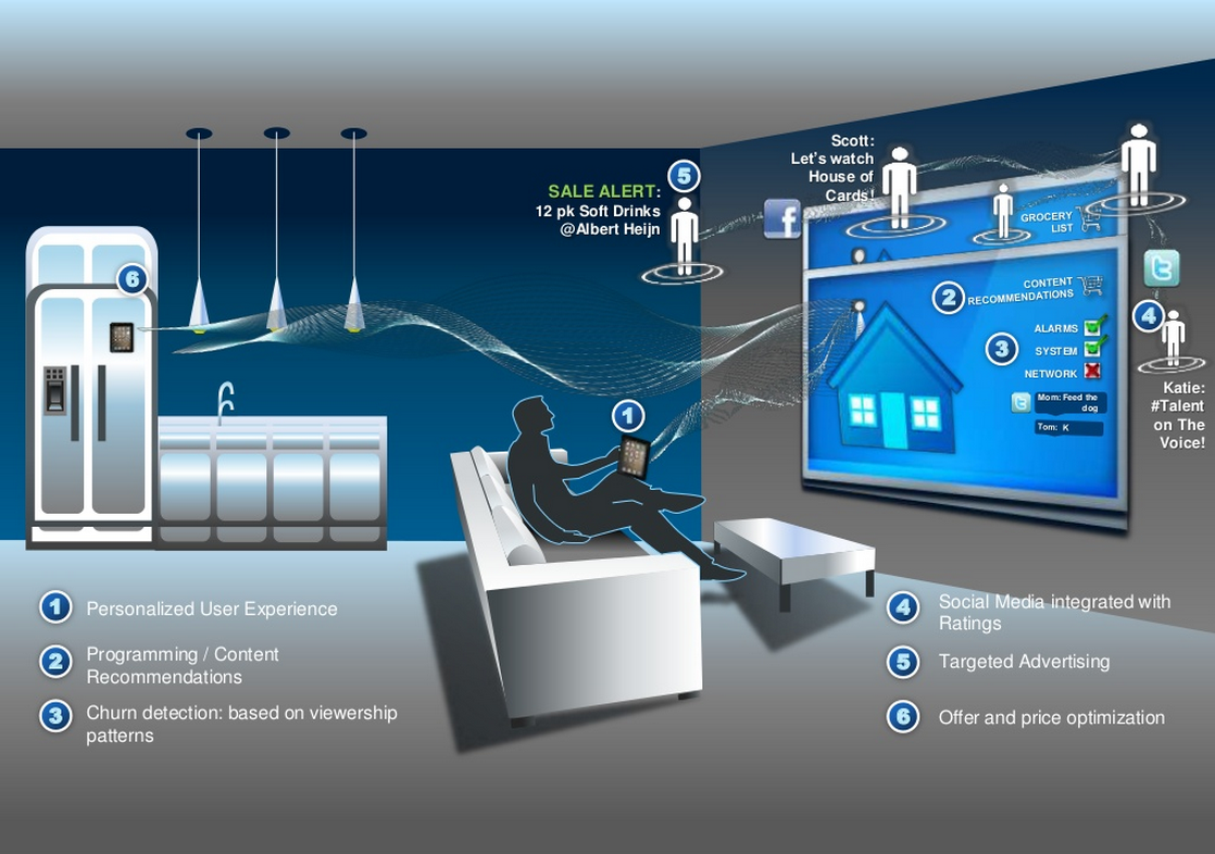 Maar ook welke apps er worden gebruikt en welke websites er worden bezocht. Ondertussen, als iedereen online aan het interacten is, houdt de koelkast bij dat de cola bijna op is en dat deze bij Albert Heijn moet worden besteld. En de thermostaat vertelt dat een van de kinderen toch echt te lang onder de douche staat.