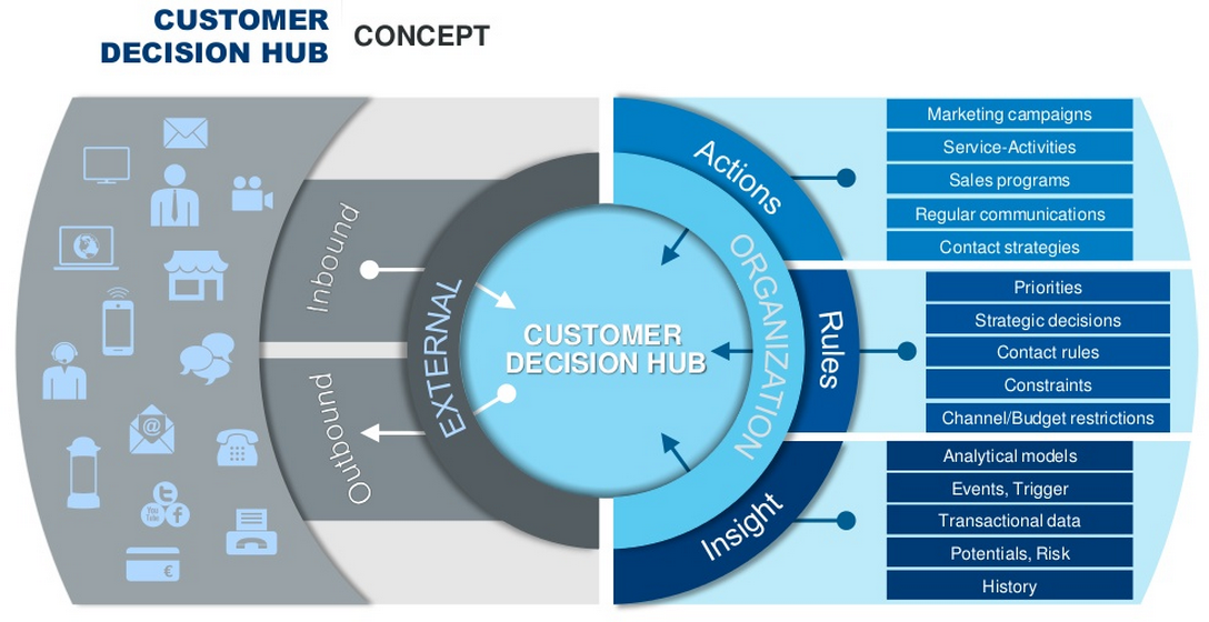 Deze Customer Decision Hub neemt de klant als middelpunt en brengt klantinformatie samen vanuit: