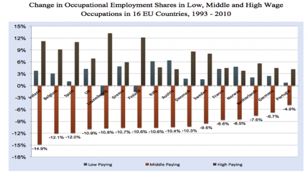Interessant in dit geval is ook de grafiek van David Autor, afkomstig uit zijn onderzoek “Polanyi’s Paradox and the Shape of Employment Growth”, die momenteel op internet de rondte gaat. De grafiek laat de ontwikkeling binnen de arbeidsmarkt zien. Ten opzichte van 1993 is het relatieve aandeel van het middensegment sterk onder druk komen te staan als gevolg van computerisation. De machines nemen het werk dus over!