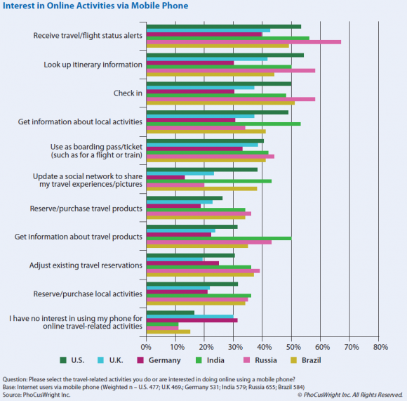 Opvallend is dat Europa hierin achterloopt, terwijl de respondenten uit de BRIC-landen juist relatief hoog scoren. Niet alleen op deze vraag scoren zij hoog, maar ook op vele andere vragen scoren zij hoger dan wij ‘Westerlingen’ als het gaat om de behoefte aan mobiele ondersteuning tijdens de vakantie. Het lijkt alsof veel moderne reizigers uit deze snel opkomende economieën onze ‘desktop-decade’ hebben overgeslagen, en direct mobiel zijn gegaan en daarmee wellicht voorlopen op Europa.