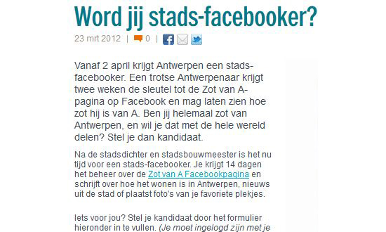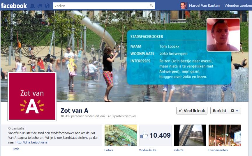 De gemeente Antwerpen is erin geslaagd om de betrokkenheid van haar burgers te vergroten door de gecombineerde inzet van klassieke en social media. Interactiviteit en participatie staan daarbij centraal. Antwerpen heeft een eigen social media manager. Groot succes is de Stadsfacebooker-pagina ‘Zot van A’ (10.409 fans). Om de twee weken mag een nieuwe Antwerpenaar deze Facebookpagina beheren en laten zien hoe ‘zot’ hij is op zijn mooie stad. Zo moedigt de gemeente gesprekken tussen bewoners aan.