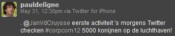 Jan Van der Cruysse, woordvoerder van The Brussels Airport Company, deelt de anekdote dat Twitter dusdanig low profile was gestart, dat het een jaar duurde voordat de airportdirectie in de gaten kreeg dat het bedrijf @BrusselsAirport als corporate Twitter account (7.055 volgers) had. Van der Cruysse beheert zelf dit account omdat veel journalisten de account volgen. Voertaal op Twitter is vooral Engels. De airport heeft een social media-manager voor de overige channels. Facebook wordt meer gebruikt voor marketing en productintroducties. Monitoring van het social web gebeurt zonder buzzmonitor.