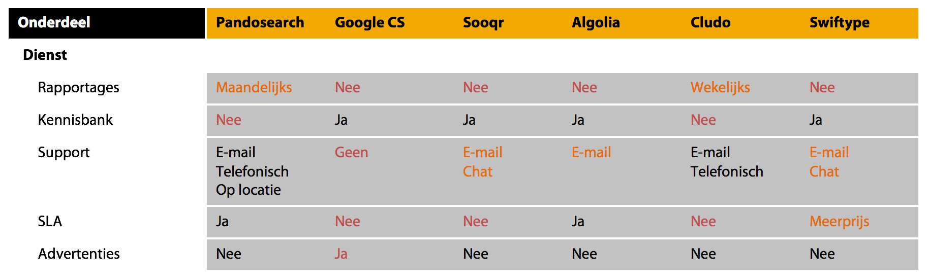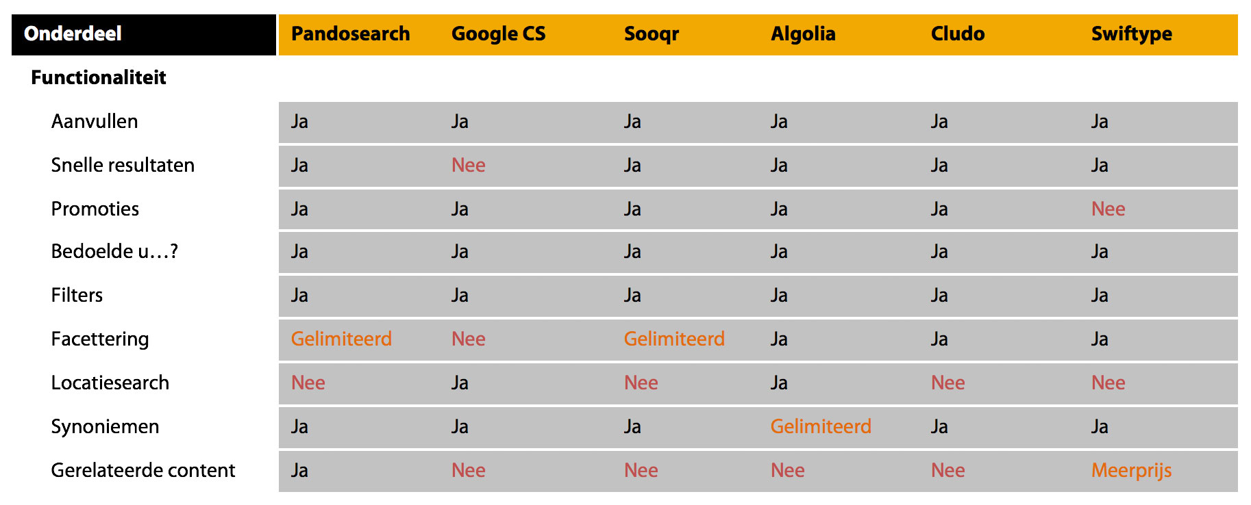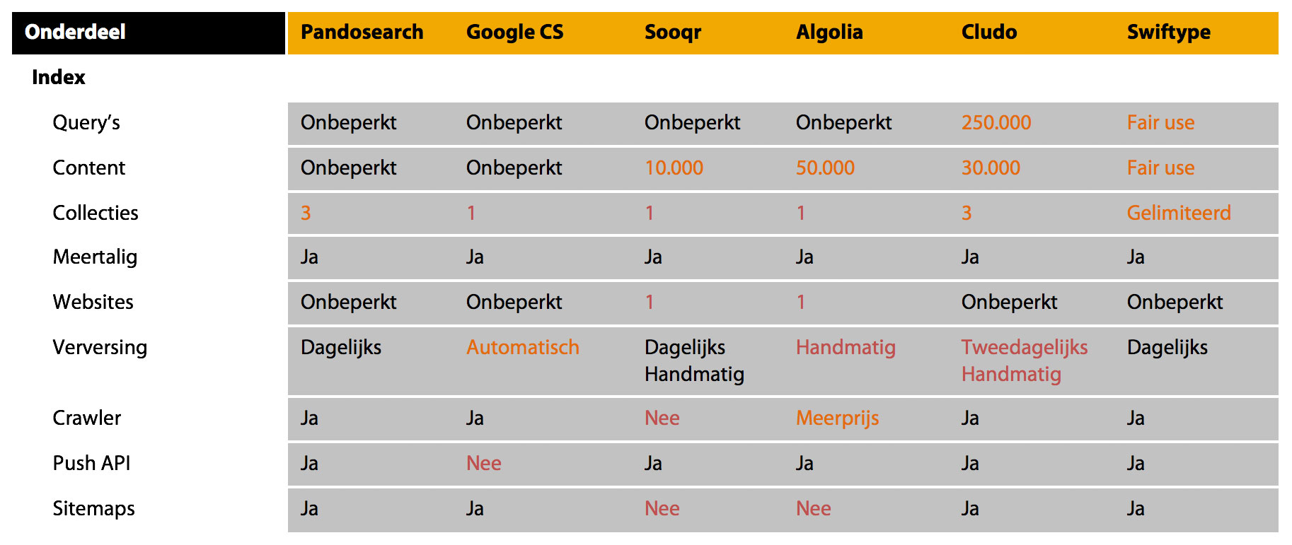 In onderstaande tabellen vergelijken we een aantal searchtools voor je, te weten:
