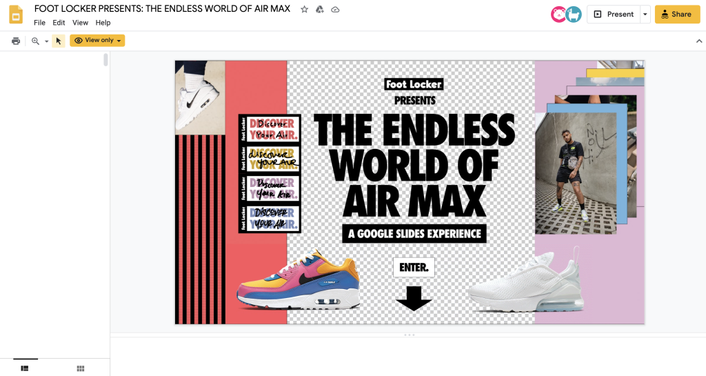 Een opmerkelijke toepassing van Google Slides. Footlocker heeft een interactieve hub gemaakt voor sneakerheads om ‘de eindeloze wereld van Air Max’ op Google Slides te verkennen. De retailketen lanceerde het Google Slides-project als onderdeel van zijn ‘Discover Your Air’-campagne. Elke sectie is gevuld met traktaties, waaronder feiten, trivia-quizzen en productdiscussies, waardoor fans zich kunnen vermaken met de constant evoluerende lijst van Air Max-sneakers. De one-stop-shop voor Air Max bevat links voor aankopen, zodat bezoekers volledig op de hoogte zijn van sneak previews en product drops. Zien we hier de geboorte van een nieuw interactief communicatiekanaal? Klik maar eens door de experience van meer dan 100 slides. Best indrukwekkend.