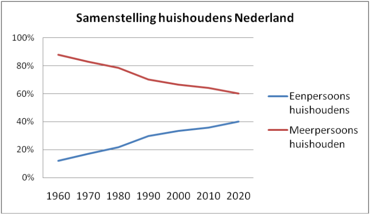 Een kwantitatieve uitdrukking van het maatschappelijk proces van individualisering is de stijging van steeds meer kleine zelfstandige huishoudens. Aanleiding voor deze toename is enerzijds het aantal alleenstaande ouderen en anderzijds het later gaan samenwonen van jongeren. Volgens CBW-Mitex betekent meer huishoudens een kans voor de retail, maar zal het aanbod hier wel op afgestemd moeten worden. In 2020 zullen vier uit de tien huishoudens nog maar bestaan uit één persoon, concreet ruim drie miljoen huishoudens.