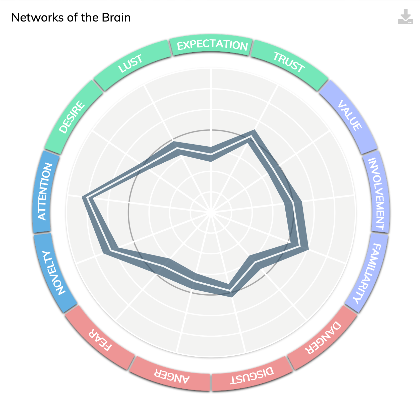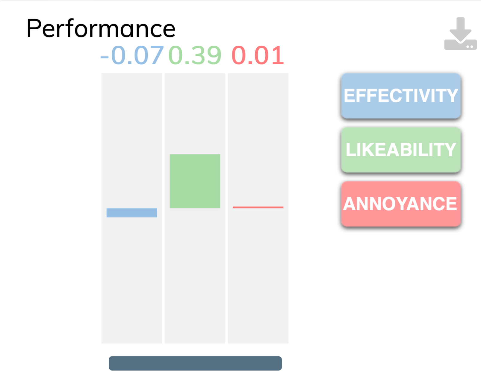 In onze studie scoort deze Lexus commercial vooral erg goed op ‘likability’, zeg maar de gemiddeld leuke of interessante commercial. En dat verbaast ons eigenlijk niets. Wie het gemiddelde effect van tientallen prijswinnende commercials in één uiting kan vangen, kan er bijna niet naast zitten. De grafiek hieronder laat de sterke correlatie met ‘Likability’ zien. In de spider-grafiek verderop, zien we veel aandacht en verrassing, en goed van vertrouwen en vooral weinig negatieve emoties. Maar ja.., de correlatie met effectiviteit is negatief, of beter gezegd: hij doet niet bijzonder veel voor de verkoop van de auto, er is te weinig Expectation; what’s in it for me, en dat is wat goede reclame moet verkopen; een hoge verwachting van de waarde voor de aanstaande koper.