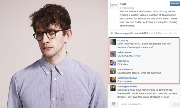 Neem het merk Audi, dat het belangrijkste doel van het eigen Instagram-account uit het oog verloor toen het de nieuwe A3 sedan wilde promoten via dat kanaal. Ze hadden een creatief idee, maar dat bracht hun doelgroep helaas in verwarring. Zoals uit volgend screenshot blijkt verwachtte de doelgroep zeker niet de hipsters van de #paidmydues-campagne te zien:
