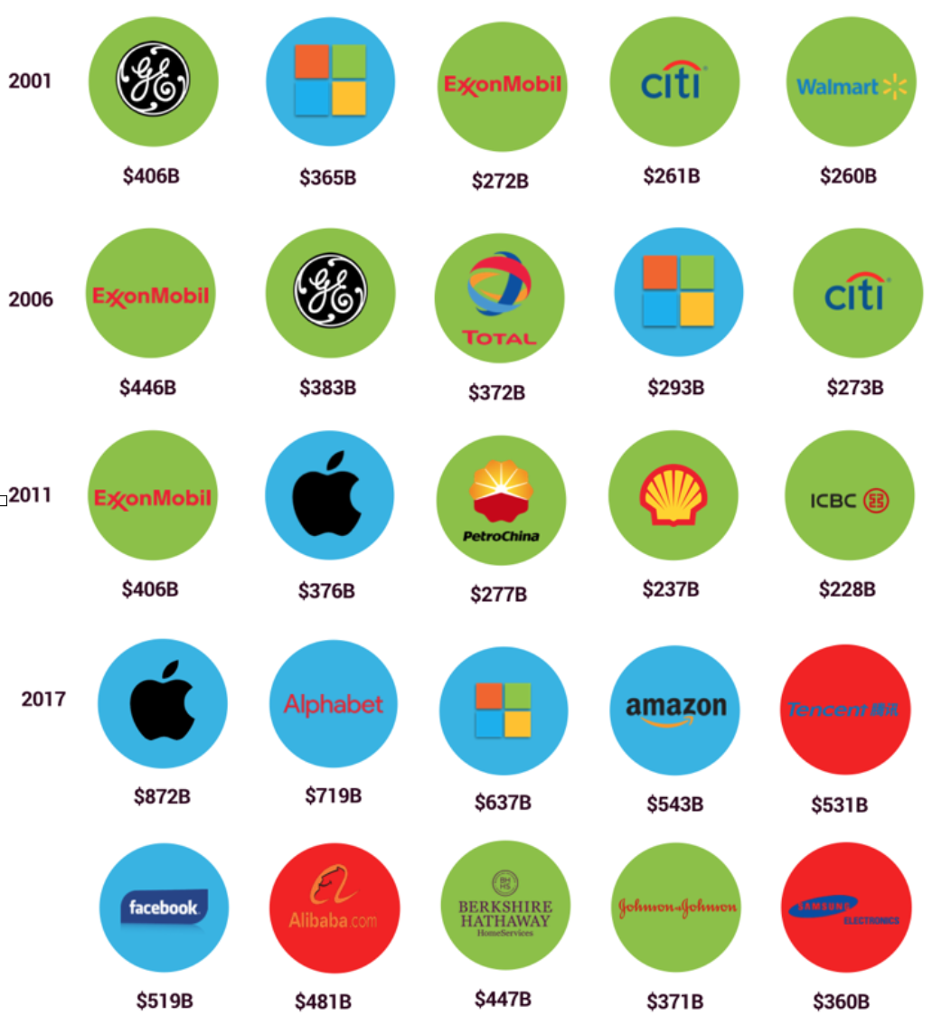 Naar beurswaarde gemeten, hebben de pijpleidingindustrieën van de twintigste eeuw stuivertje gewisseld met de whiz kids van Silicon Valley.