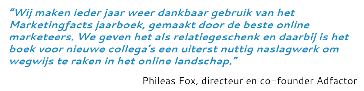 We zijn druk bezig met de laatste loodjes voor het Marketingfacts Jaarboek 2016-17. Deze 11e editie verschijnt in mei 2016 en is verplichte kost voor iedereen die met marketing te maken heeft of krijgt. We bieden een beperkt aantal adverteerders de mogelijkheid om in ons Jaarboek te adverteren. Als je daar meer over wilt weten, of als je een Jaarboek met een gepersonaliseerde omslag als (relatie)geschenk wilt gebruiken, reageer dan voor 15 april!