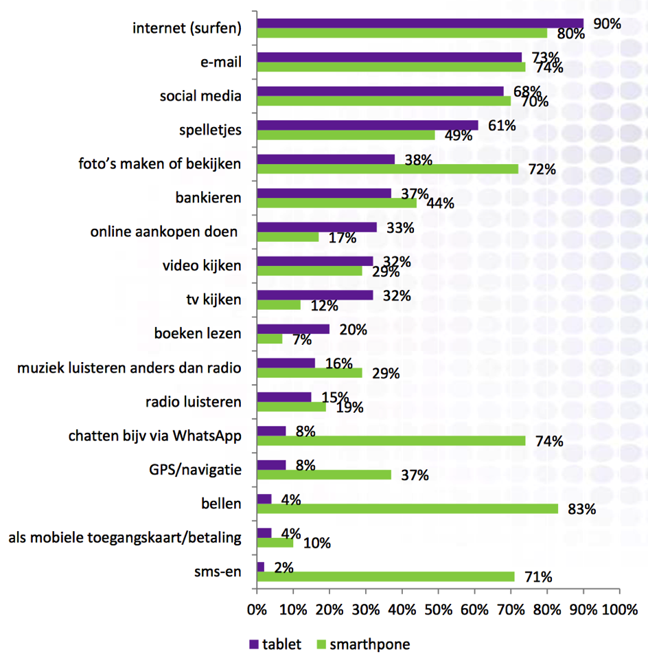 Het gebruik van tablets en smartphones is enigszins met elkaar te vergelijken. Zowel smartphones als tablets lenen zich voor on the go activiteiten, maar in de praktijk zien we dit het meest terug bij smartphones. Zo maken smartphonegebruikers vaker foto’s en gebruiken ze vaker navigatie. Communiceren via bijvoorbeeld social media (70 procent), WhatsApp (74 procent), sms (71 procent) en e-mail (74 procent) vormt een van de belangrijkste functies van de smartphone. Tabletgebruikers zijn meer bezig met surfen en maken meer gebruik van entertainment en long-form content dan smartphonegebruikers. Denk hierbij aan gamen, video’s kijken en boeken lezen.