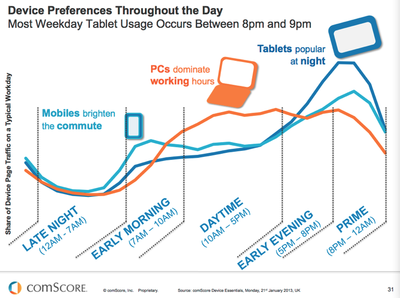 Het onderscheid tussen de tablet, smartphone en desktop heeft ook effect op de tijden waarop de gebruiker het apparaat bedient. In de vroege ochtend zien we dat smartphones en tablets meer gebruikt worden dan de desktop. Vervolgens voert het gebruik van desktop het overgrote deel van de (werk)dag de boventoon. Vanaf het begin van de avond zien we het gebruik van smartphone en tablet weer stijgen. We kunnen concluderen dat er gretig gebruikgemaakt wordt van de tablet in de avonduren.