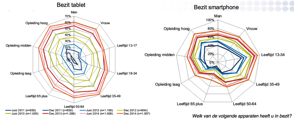 Tabletbezit blijkt beduidend gelijkmatiger verdeeld over de verschillende bevolkingsgroepen dan smartphonebezit. Onder jongeren van 13 tot en met 34 jaar is de penetratie van de smartphone het hoogst. Wel neemt de achterstand van de 65+-groep af in vergelijking met vorig jaar. Het tabletbezit is het hoogste onder 35-49-jarigen. Voor beide devices geldt dat ze het meest worden gebruikt door hoogopgeleiden (‘Trends in Digitale Media 2014’ van GfK).