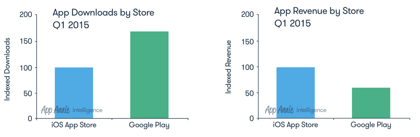 Uit cijfers van AppAnnie (‘App Annie Index Market Q1 2015‘) blijkt dat bezoekers van Google Play gemiddeld meer apps downloaden dan iOS-gebruikers. Maar als het om omzet gaat, wint Apple het nog altijd ruim van Google. De App Store draaide in het eerste kwartaal van 2015 ruim 70 procent meer omzet dan Google Play.