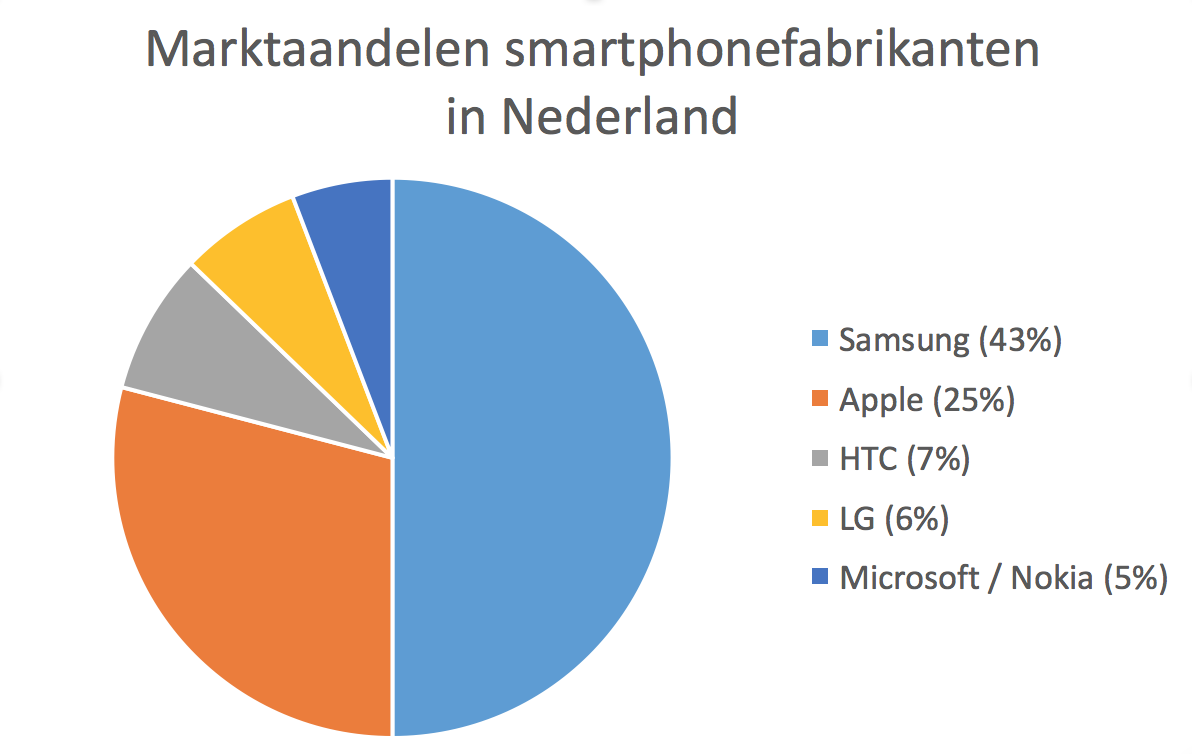 In Nederland is Samsung marktleider met een marktaandeel van 43 procent en wordt op enige afstand gevolgd door Apple met een marktaandeel van 25 procent. HTC (7 procent), LG (6 procent) en Microsoft/Nokia (5 procent) completeren de top vijf van Nederland. Sony, Huawei en Blackberry hebben allemaal een marktaandeel van minder dan 5 procent. Dat blijkt uit cijfers van Shareforce.