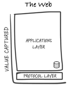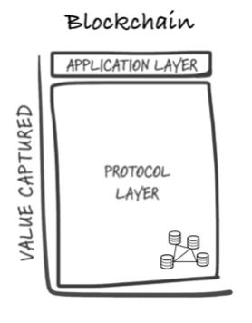 Het blockchain protocol kantelt het “winner-takes-all”-model dus om, data wordt nu wel op het allerlaagste niveau – in het protocol zelf – opgeslagen. Uiteraard kunnen op deze laag ook allerlei applicaties worden gebouwd, maar het biedt de makers niet de voordelen die de eerder genoemde platformbedrijven hebben, omdat de waarde van de data dit systeem niet verlaat, deze blijft toebehoren aan de eigenaren van de data.