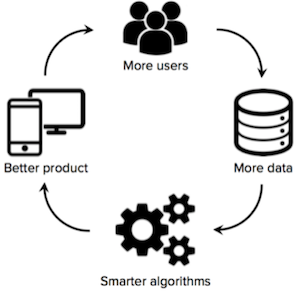 Zo verzamelt Google data over haar gebruikers als ze online zoeken. Met die data zorgen ze ervoor dat de zoekmachine met betere zoekresultaten komt, waardoor weer meer mensen de zoekmachine gaan gebruiken, en ga zo maar door. Of denk aan Tesla. De autofabrikant verzamelt de data van iedere verkochte zelfrijdende auto en analyseert al deze data om vervolgens de algoritmes van alle zelfrijdende Tesla’s te optimaliseren.