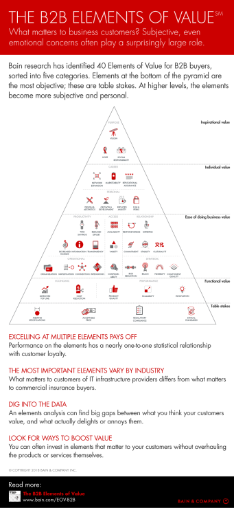 In de B2B elements of value, een vijflagenmodel gelieerd aan de piramide van Maslow, wordt in kaart gebracht hoe complex het B2B-aankoopproces is. In veertig verschillende stappen – what matters to business customers – wordt het B2B-aankoopproces beschreven. Zo voorziet het model in de ‘table stakes’ de ethische standaarden van een bedrijf, in de ‘functional value’ de mate van innovatie, in ‘ease of doing value’ de expertise en stabiliteit van een bedrijf en ten slotte bij de ‘inspirational value’ de purpose van het bedrijf.