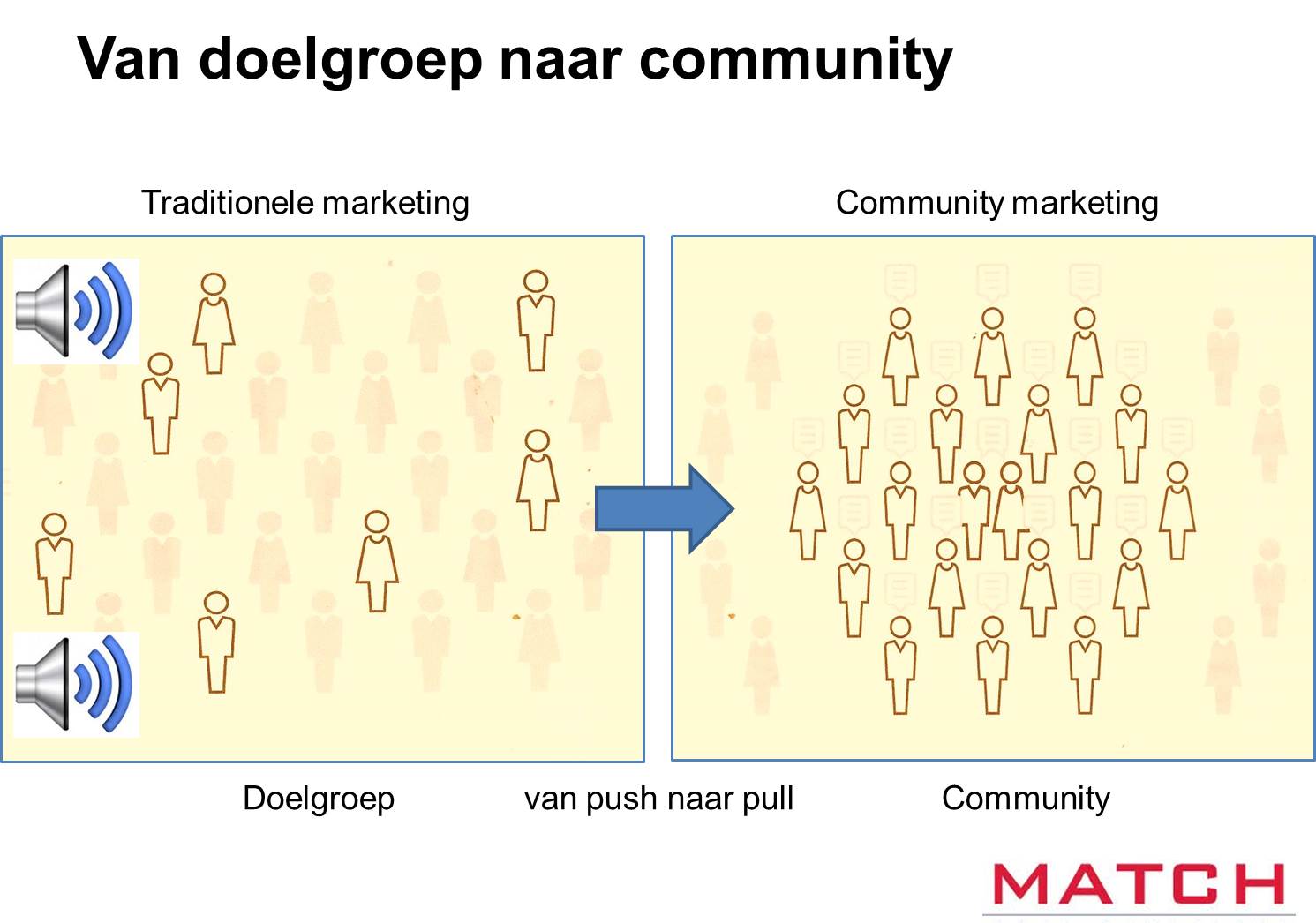 Communities ontstaan organisch rond mensen met een gezamenlijke overtuiging. Ze ontstaat rond normen, waarden en mentaliteit. Een benadering per doelgroep is niet nodig; members van de community hebben dezelfde overtuiging over de toekomst en het voelt allemaal even persoonlijk aan.