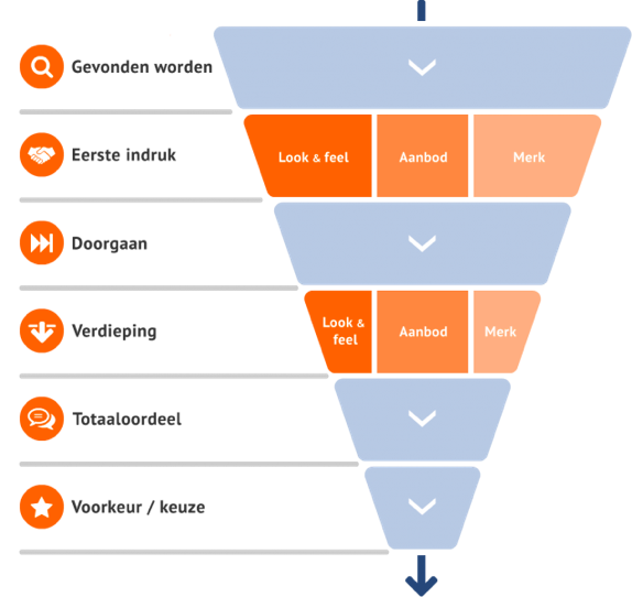 Iedere marketeer herkent in dit model de funnel en zo is het model ook opgebouwd. Eerst word je als bedrijf of aanbieder van een dienst al dan niet gevonden, aan het begin van de customer journey. Vervolgens ontstaat een eerste indruk in de gelijknamige fase, die gevormd wordt door een ‘score’ op look & feel, aanbod en op merk.