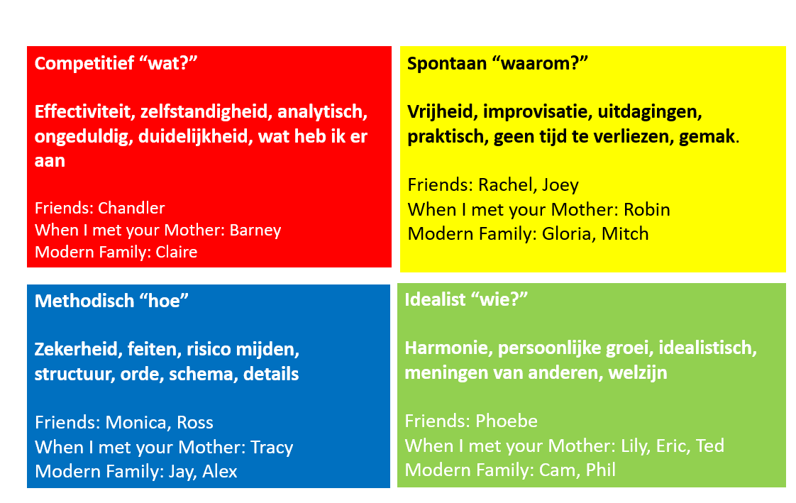 Een vereenvoudigde weergave komt tot vier groepen van type persoonlijkheden met ieder hun eigen kleur.