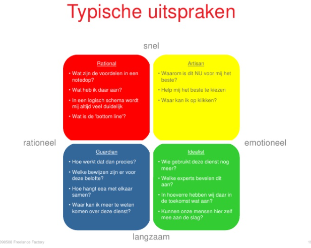Bijdragen aan het leven van anderen, persoonlijke groei, empathie. Harmonie, wil dat iedereen prettig met elkaar omgaat en zich goed voelt over zichzelf. Praat in generalisaties, overstatements en is als een soort psycholoog gevoelig voor implicaties van hetgeen mensen zeggen. Als ‘mensen-mens’ is dit type op zoek naar de meningen van anderen, in het bijzonder in de duivelse dilemma’s van de experts en wat ze daar tussen de regels uit op kunnen maken, abstract beeld, referenties, expert opinion, duidelijke persoonlijke afzender. Focus op ‘social proof’, laat echte mensen (klanten en medewerkers) zien en gezichten. Faciliteer interactie, biedt user generated content.